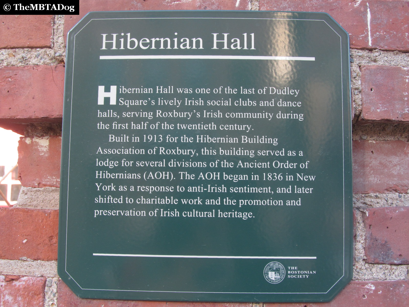 "Hibernian Hall was one of the last of Dudley Square’s lively Irish social clubs and dance halls, serving Roxbury’s Irish community during the first half of the twentieth century. Built in 1913 for the Hibernian Building Association of Roxbury, this building served as a lodge for several divisions of the Ancient Order of Hibernians (AOH). The AOH began in 1836 in New York as a response to anti-Irish sentiment, and later shifted to charitable work and the promotion and preservation of Irish cultural heritage."